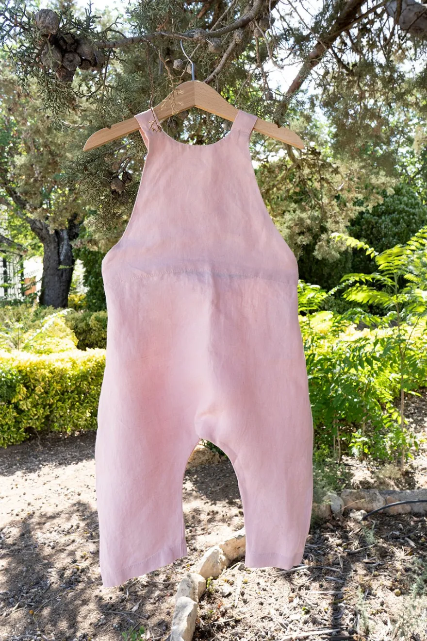 Peto de lino hecho a mano en color rosa disponible en dos tallas diferentes:
