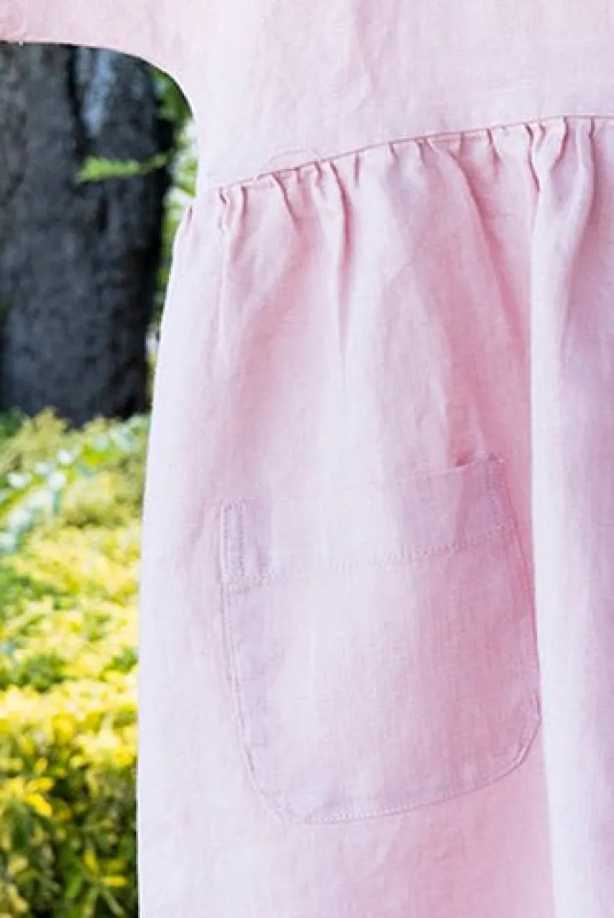 Vestido de lino hecho a mano en color rosa, disponible en cuatro tallas diferentes; de uno a dos años, de dos a tres, de cuatro a cinco y de seis a siete.