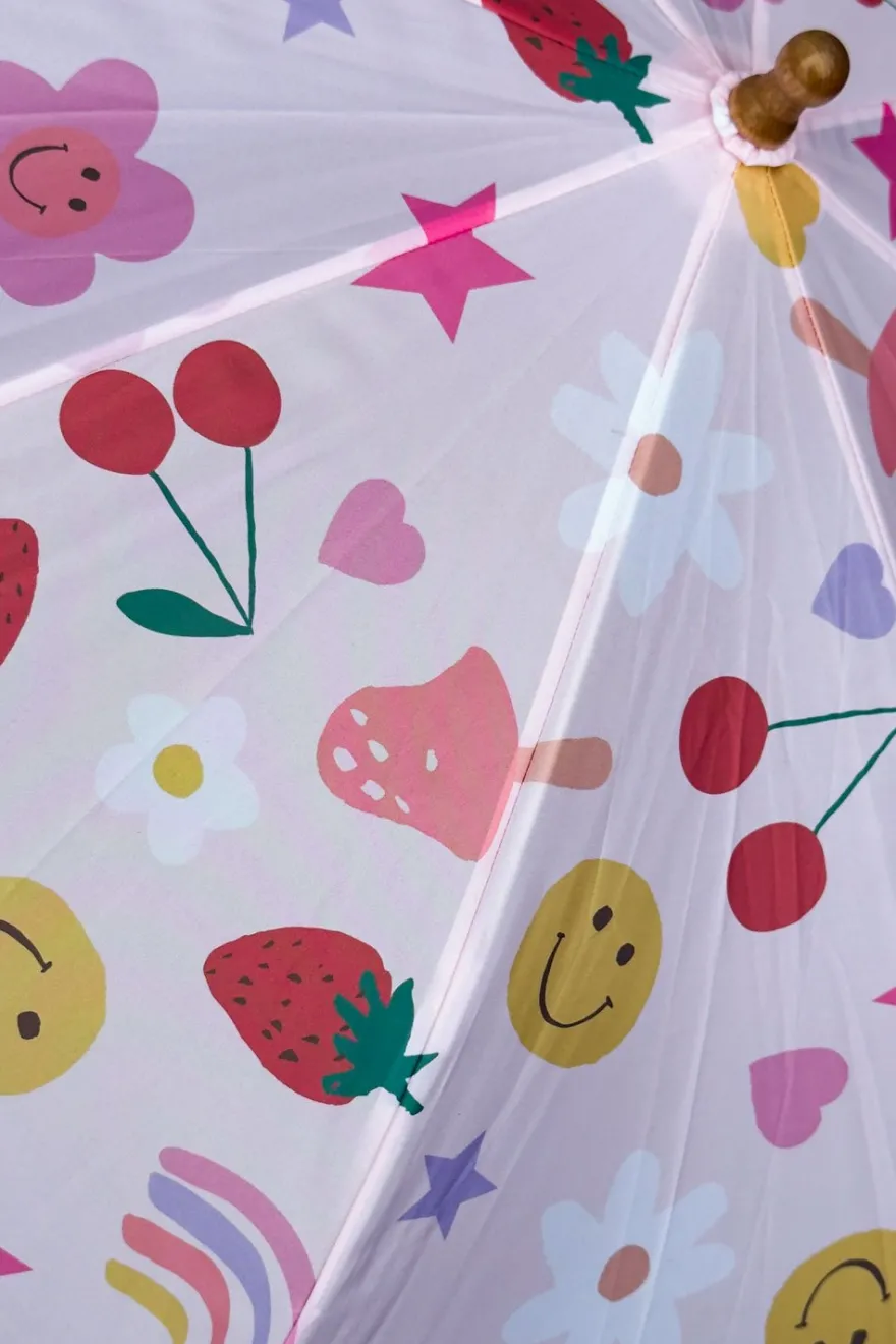 Este paraguas infantil con diseño de distintas figuras alegres y coloridas está hecho a mano a partir de nueve botellas de plástico, con tela 100% reciclada y un mango de madera de origen sostenible.