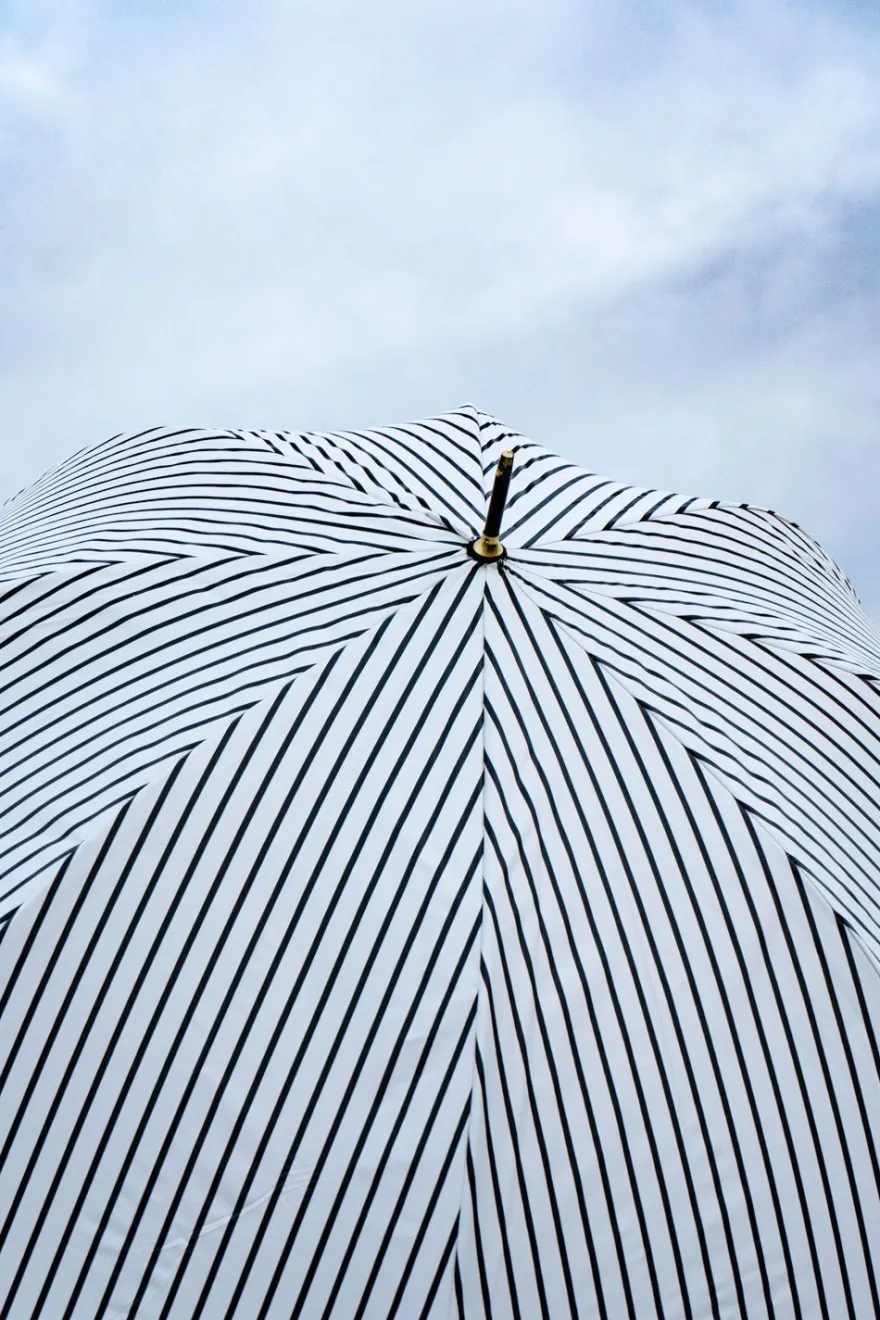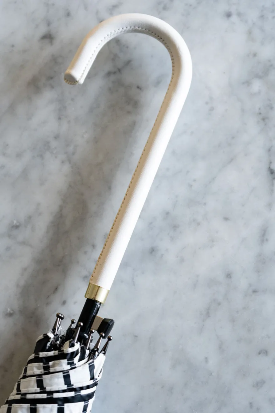 Paraguas con diseño de rayas blancas y negras, y mango de piel en color blanco.