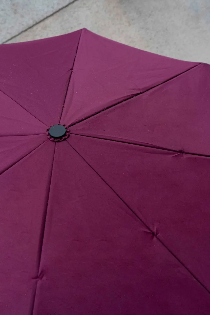 Paraguas con diseño frambuesa y mango con cabeza de pato hecho a mano a partir de nueve botellas de plástico, y diseñado en Londres.