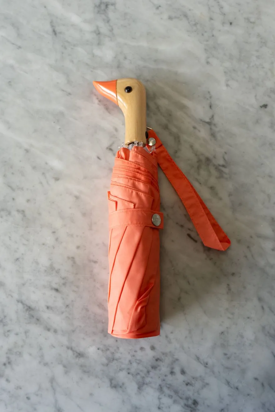 Paraguas con diseño naranja melocotón y mango con cabeza de pato hecho a mano a partir de nueve botellas de plástico, y diseñado en Londres.