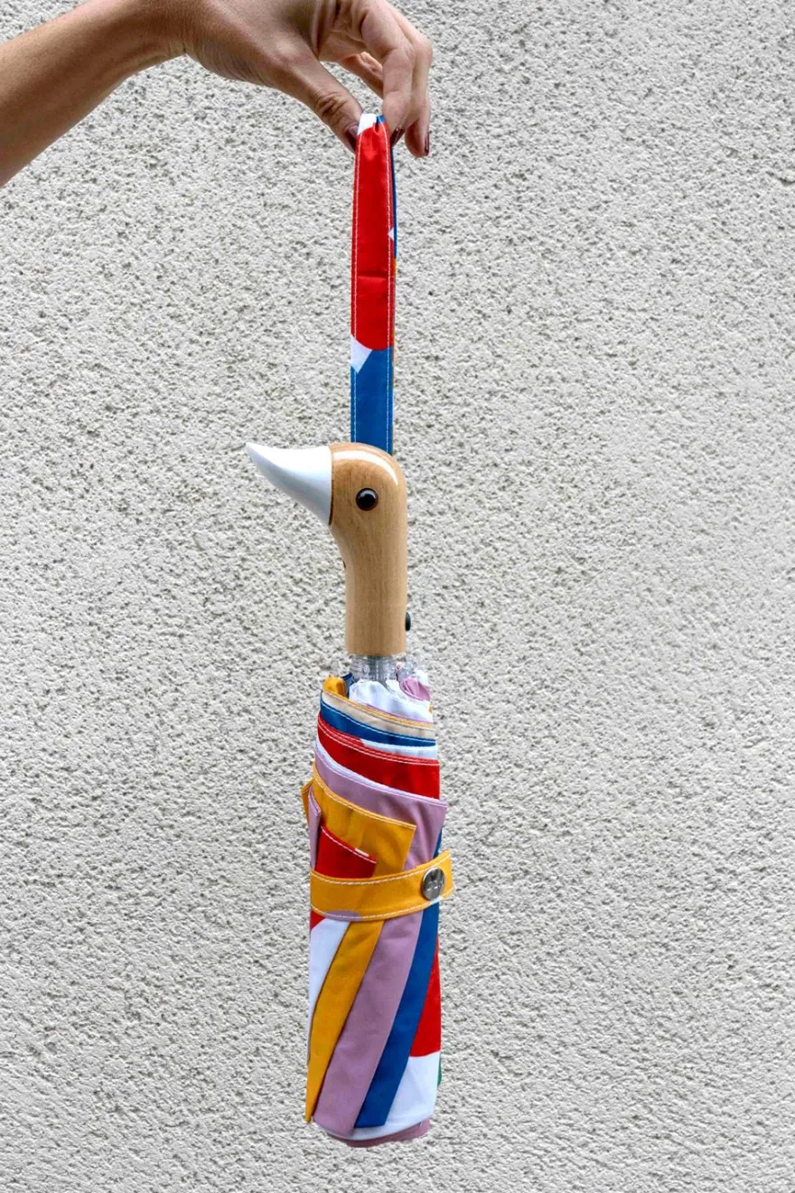 Paraguas con estampado matisse y mango con cabeza de pato hecho a mano a partir de nueve botellas de plástico, y diseñado en Londres.