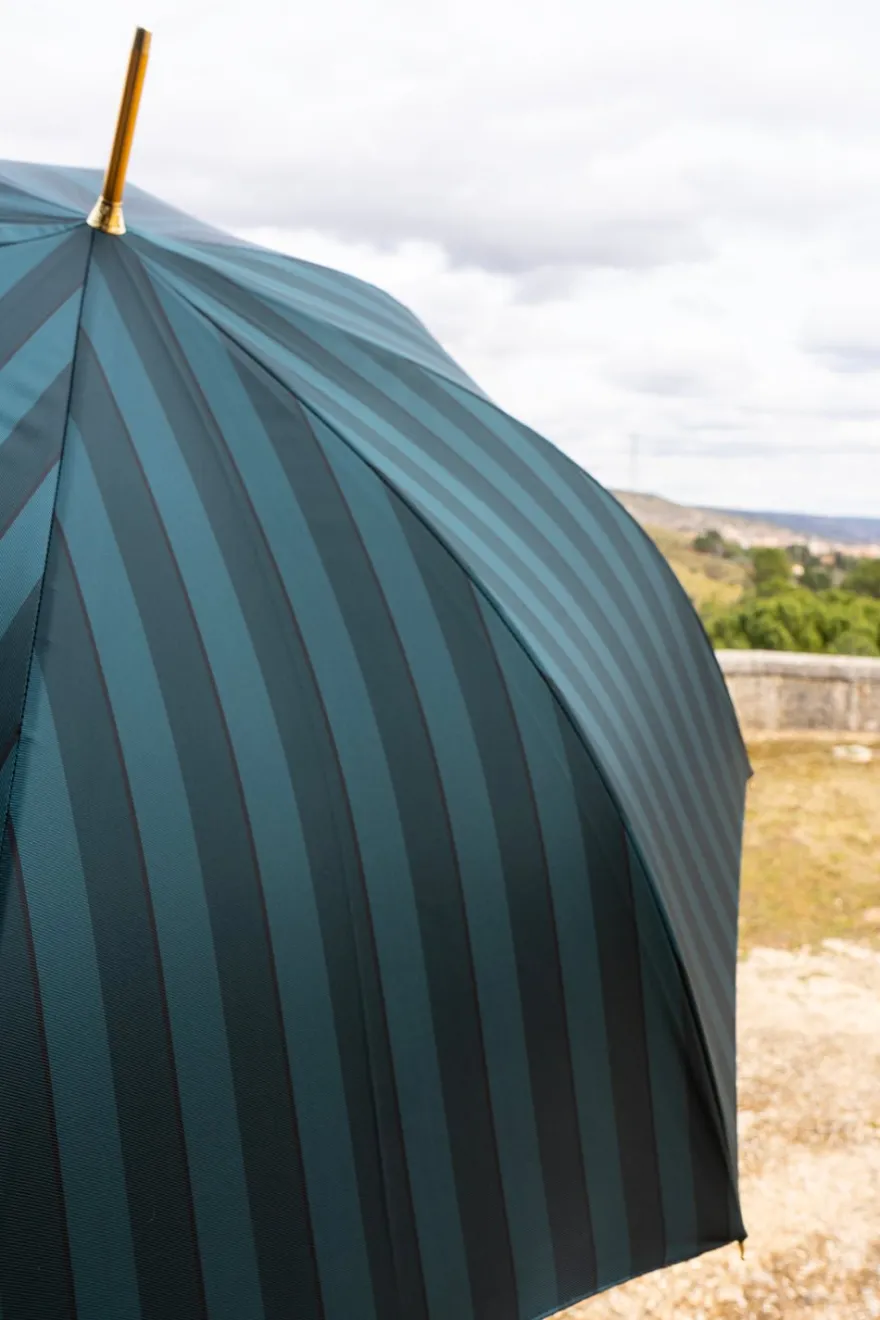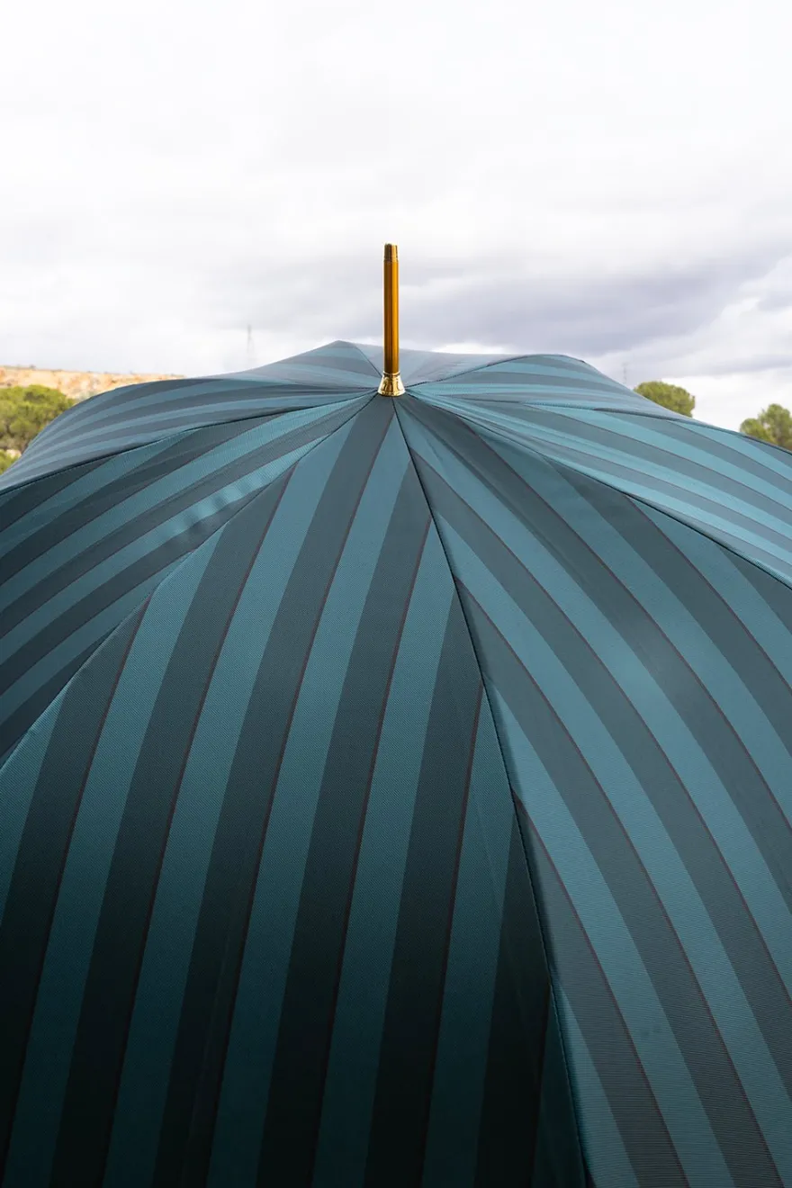 Paraguas de la marca «Pasotti» fabricado en Italia con apertura manual de 100% poliéster y mango de madera, con diseño de rayas verdes y azules.