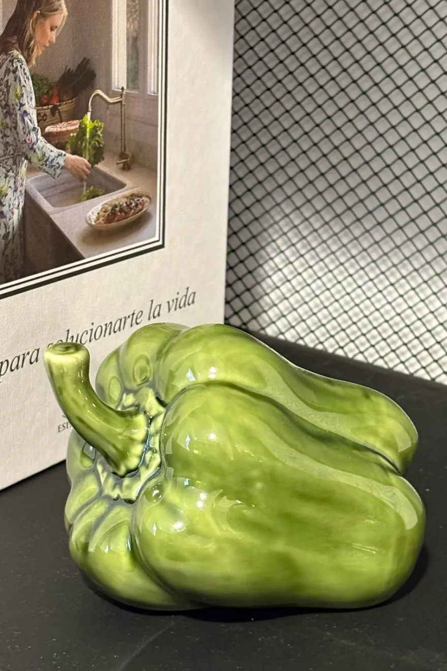 Adorno de loza fina esmaltado con diseño de pimiento en color verde,100% artesanal, ideal para complementar y dar un toque fresco, original y diferente a cualquier rincón de casa.