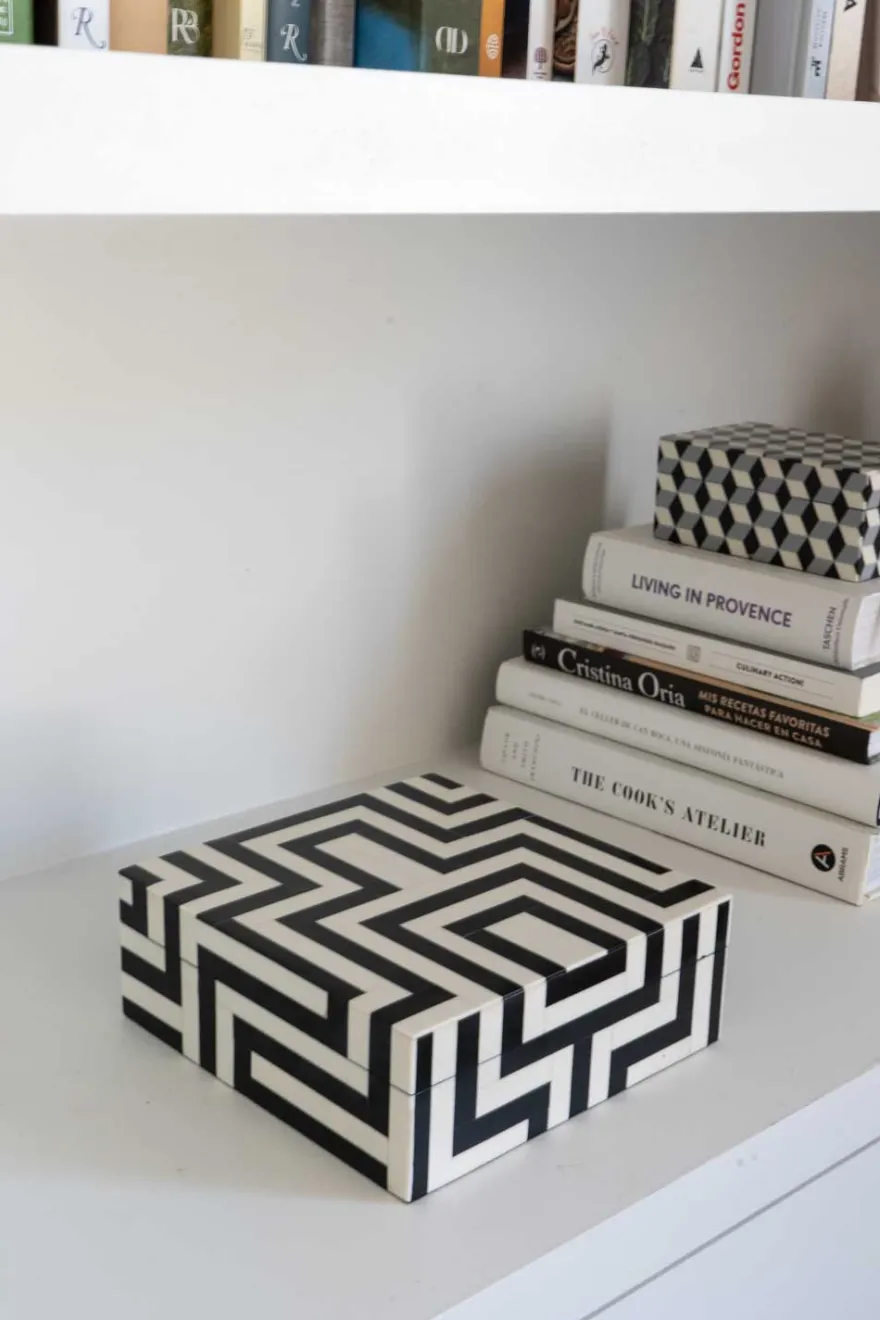 Caja decorativa de resina con diseño de puzle blanco y negro. Elaborada con patrones únicos y fabricada de manera artesanal. Estas piezas están diseñadas y pulidas de tal forma que su acabado permanece como el primer día durante mucho tiempo.