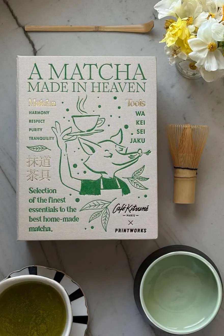 Set de té matcha, presentado en una elegante caja con forma de libro. Al abrirla, descubrirás las tres herramientas esenciales para prepararlo. Cada elemento está pensado para disfrutar de este ritual japonés de una manera única.
