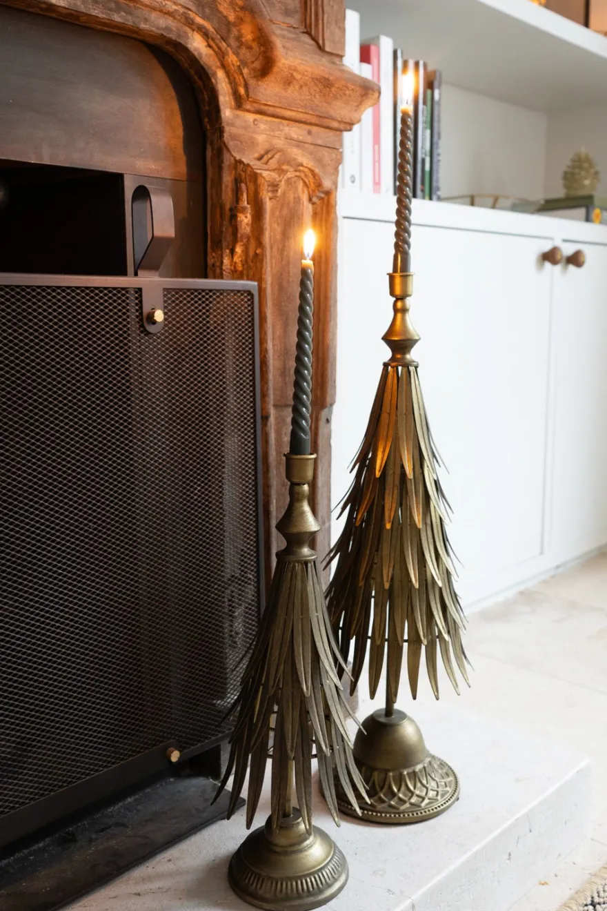 Candelabro de metal de color dorado antiguo con diseño de árbol, ideal para dar un aspecto lujoso, elegante y atemporal a cualquier rincón de tu casa.