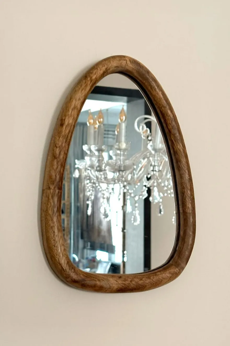 Espejos decorativos con marco de madera y diseño de forma orgánica que aportan calidez y estilo natural a cualquier espacio. Su silueta irregular los convierte en piezas decorativas únicas ideales para salones, dormitorios, recibidores o tocadores.