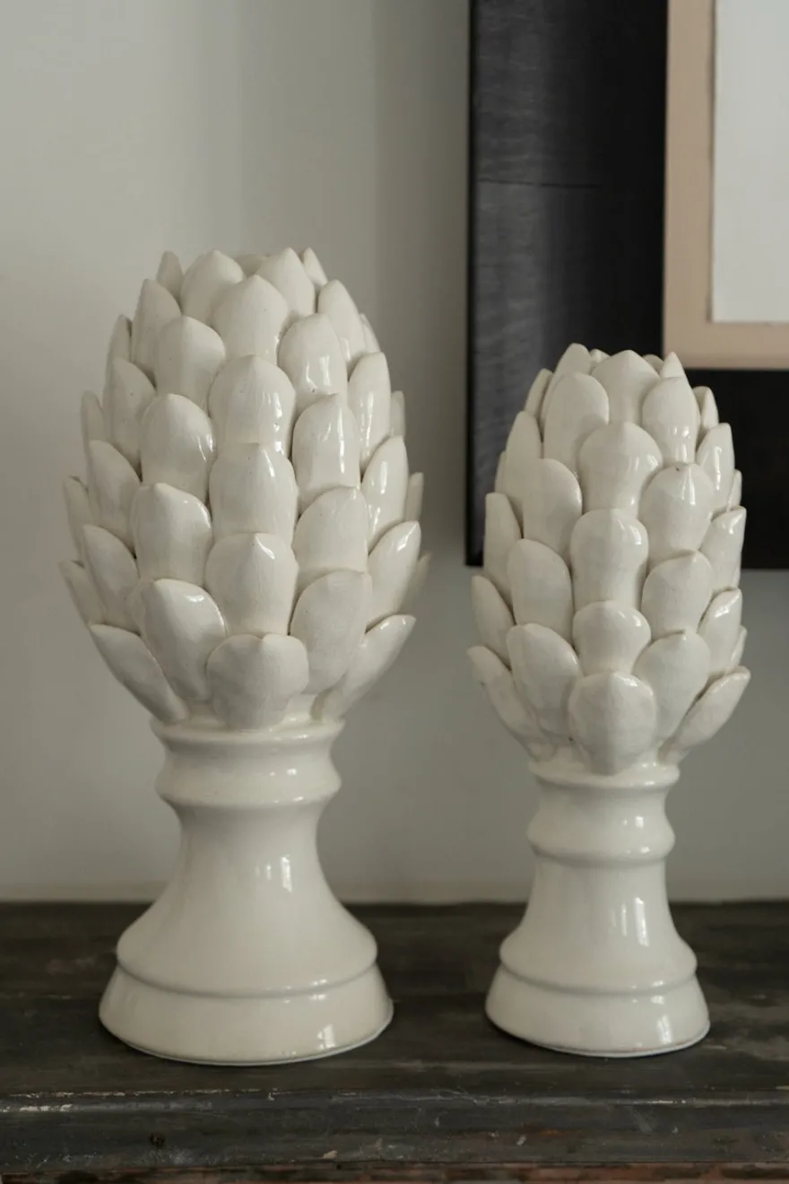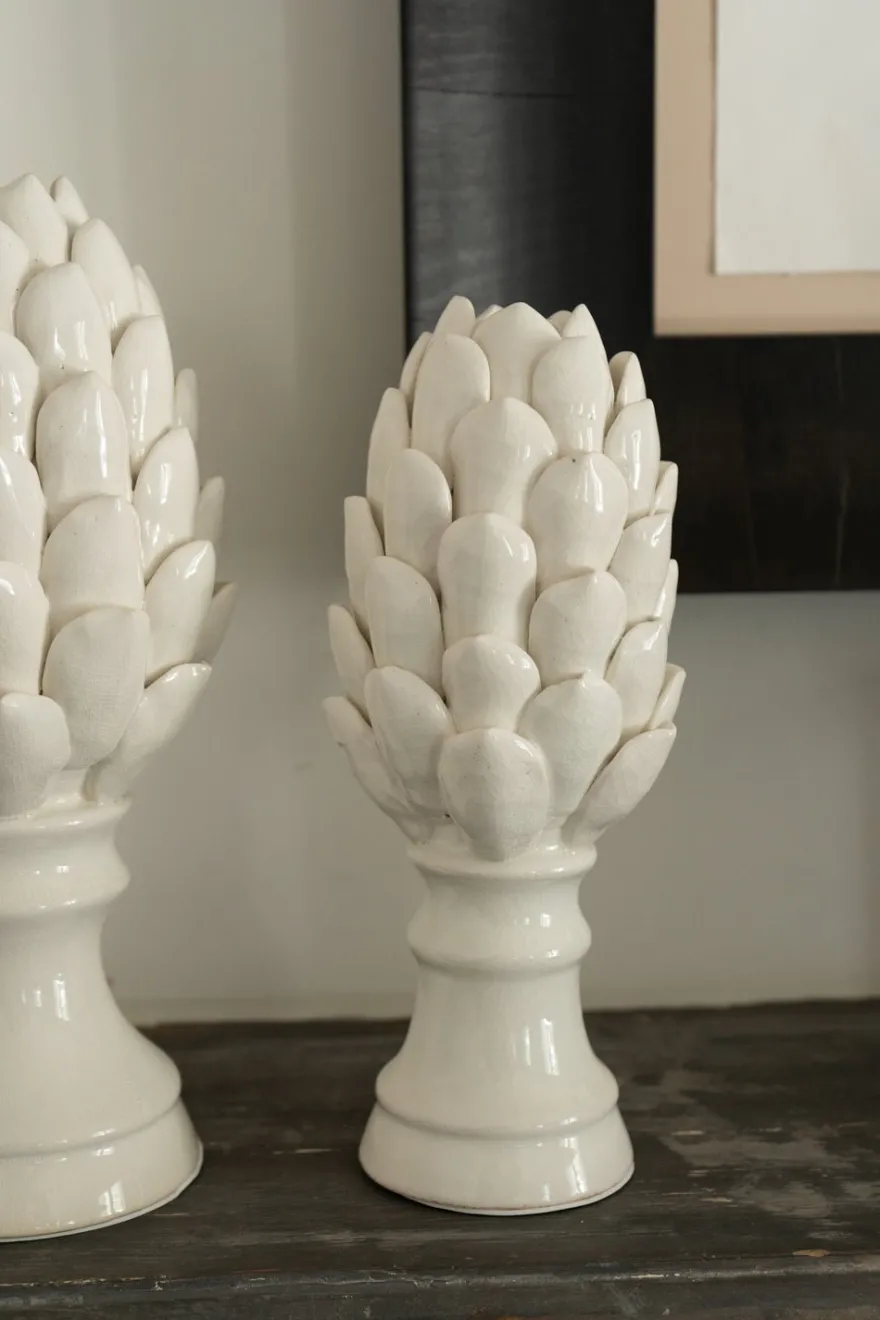 Figura decorativa de cerámica esmaltada con diseño de alcachofa blanca,100% artesanal, ideal para complementar y dar un toque fresco, original y diferente a cualquier rincón de tu casa, ya sea interior o exterior.