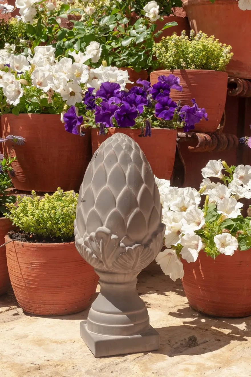 Figura decorativa de cerámica con diseño de alcachofa gris,100% artesanal, ideal para complementar y dar un toque fresco, original y diferente a cualquier rincón de tu casa, ya sea interior o exterior.