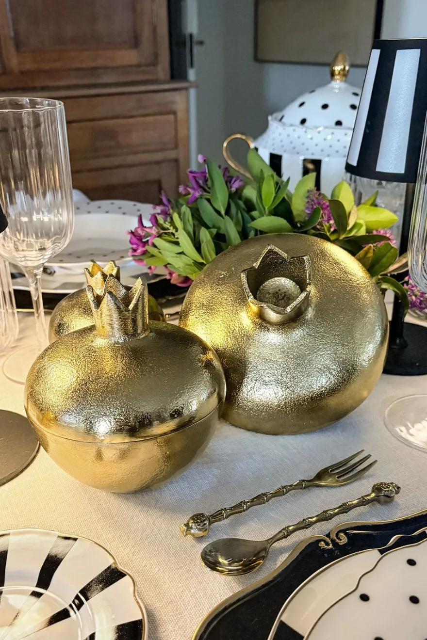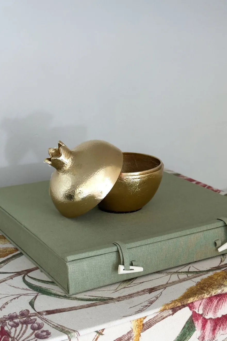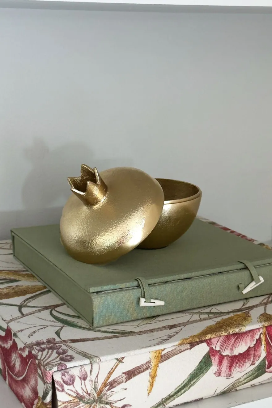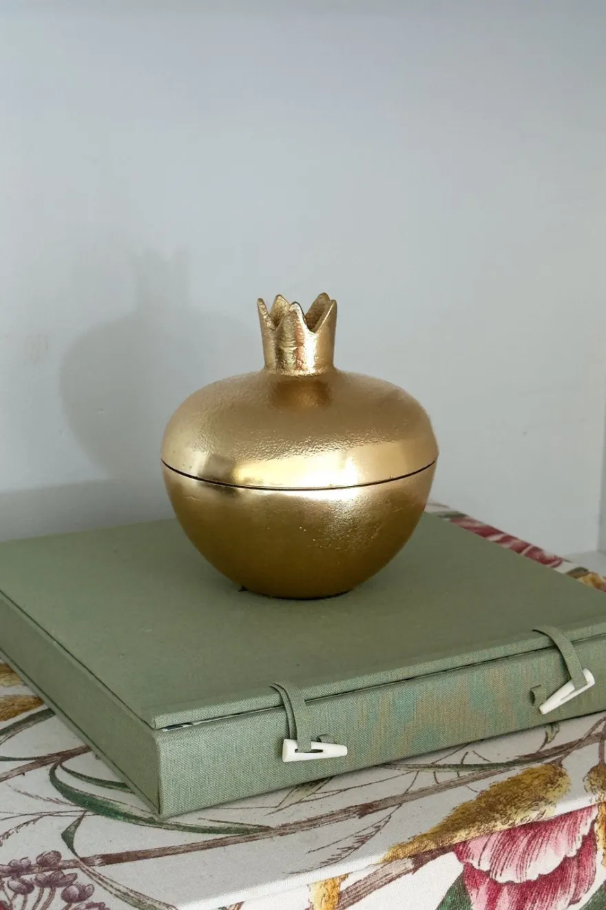 Granadas en elegante acabado dorado de bronce, diseñadas para decorar con estilo. Su tapa desmontable permite guardar objetos pequeños o utilizarse como recipiente para servir aperitivos, combinando funcionalidad y estética en un solo detalle. Disponibles en tres tamaños para adaptarse a cualquier espacio.