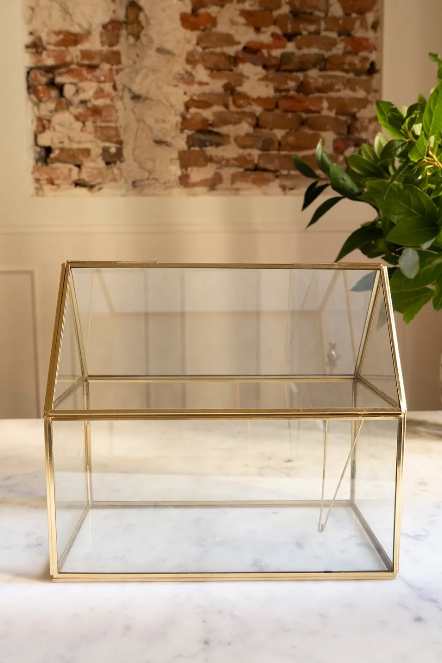 Mini invernadero con paredes de cristal y remates en dorado, ideal tanto para interiores como para exteriores.