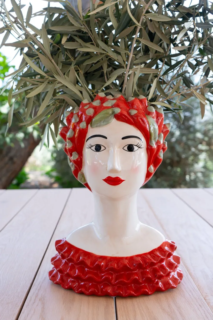 Jarrón de porcelana italiana con diseño de busto de mujer y chilis, pintado a mano, ideal para darle un toque artesanal a la decoración de tu hogar.