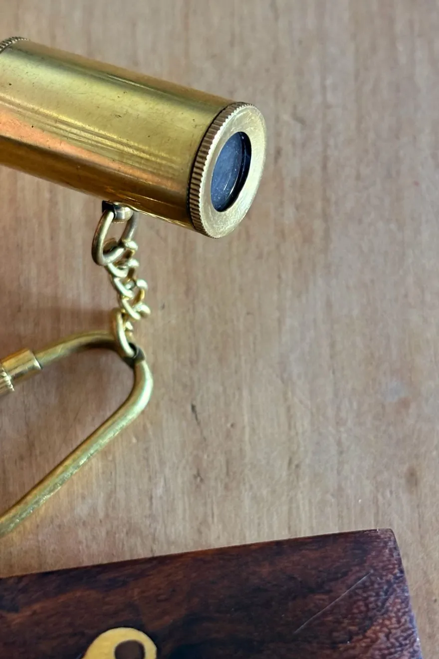Original llavero inspirado en los clásicos catalejos de navegación, con acabado en tono latón que le aporta un elegante estilo náutico y vintage.