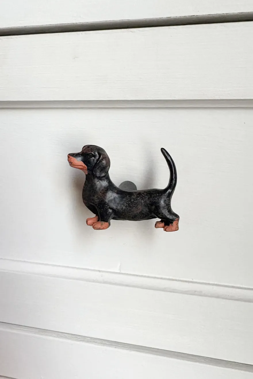 Este tirador de metal con diseño de teckel es una pieza única que aporta un toque divertido y elegante a cualquier puerta o armario. Ideal para los amantes de los perros.