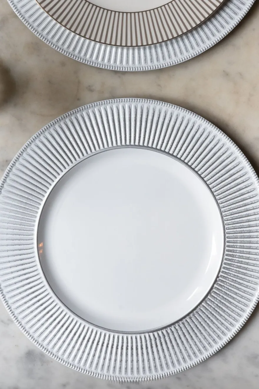 Bajoplato blanco con detalles plateados, ideal para complementar tus mesas en cualquier ocasión especial.