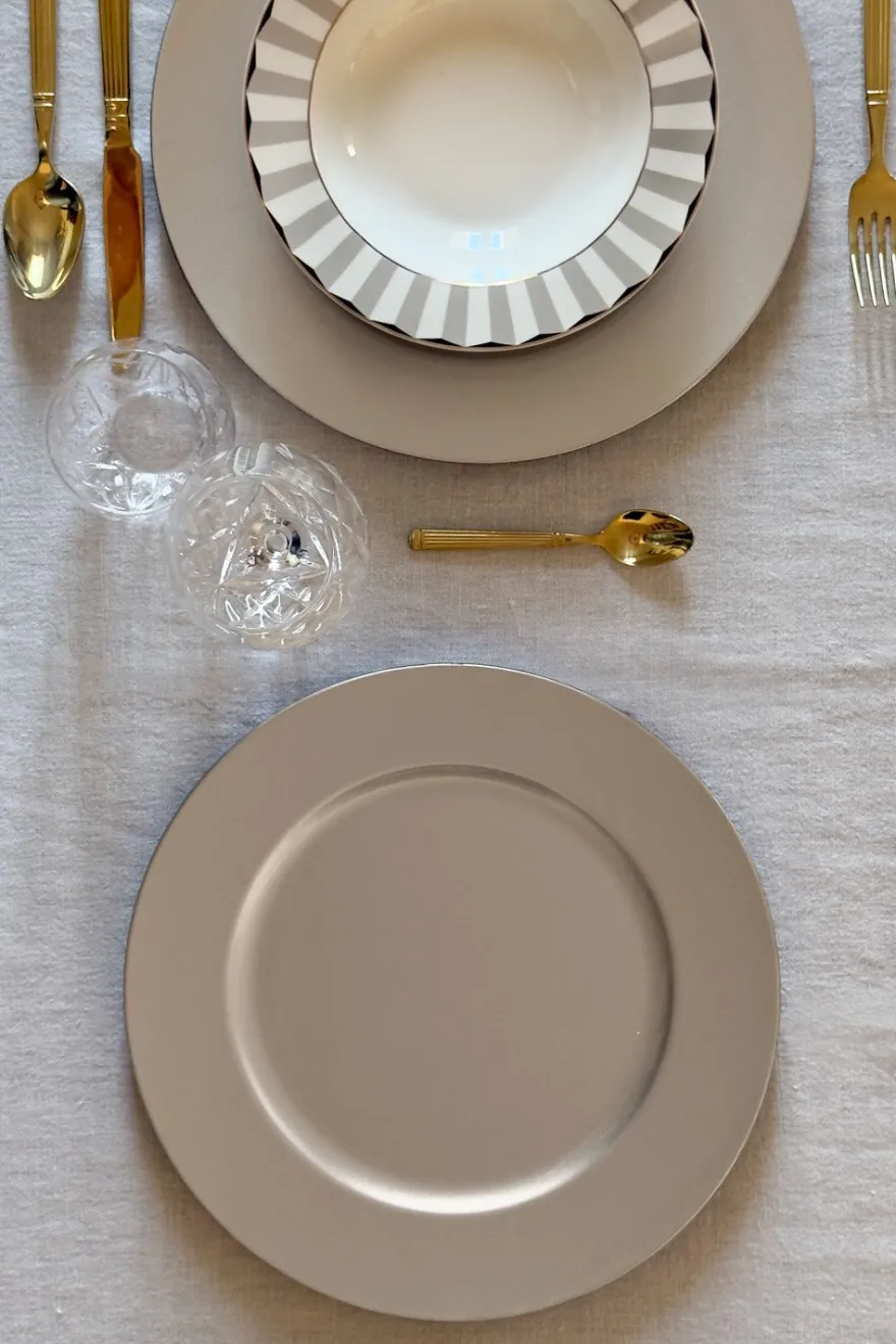 Bajoplato de PVC en color plateado. Su diseño elegante y versátil lo convierte en la base perfecta para resaltar cualquier vajilla. Fácil de limpiar y resistente, ideal para celebraciones especiales como Navidad, Año Nuevo o cualquier ocasión en la que busques un toque de distinción.