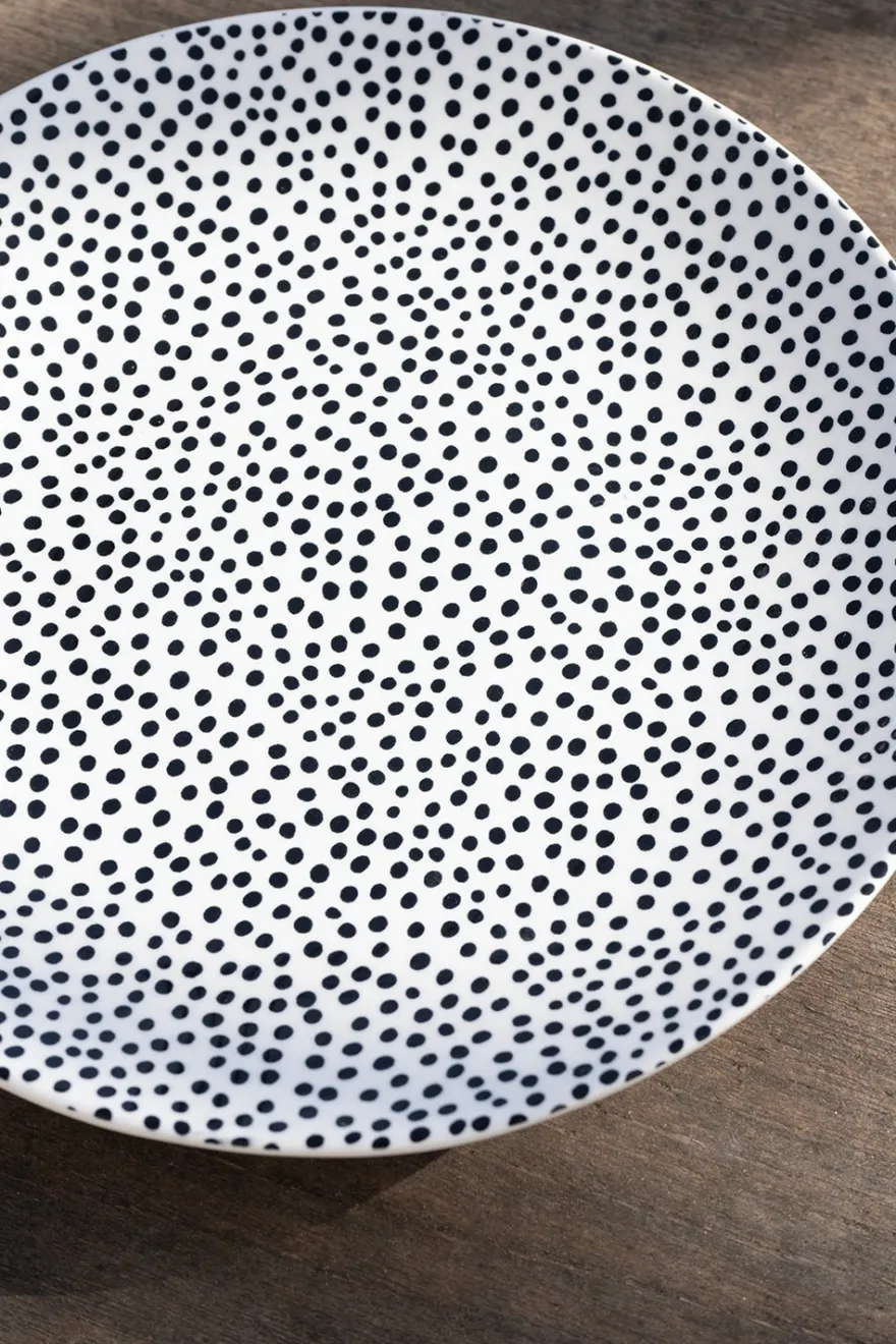 Plato de New Bone China en color blanco con puntos en color negro, su diseño es ligeramente irregular con estilo artesanal.