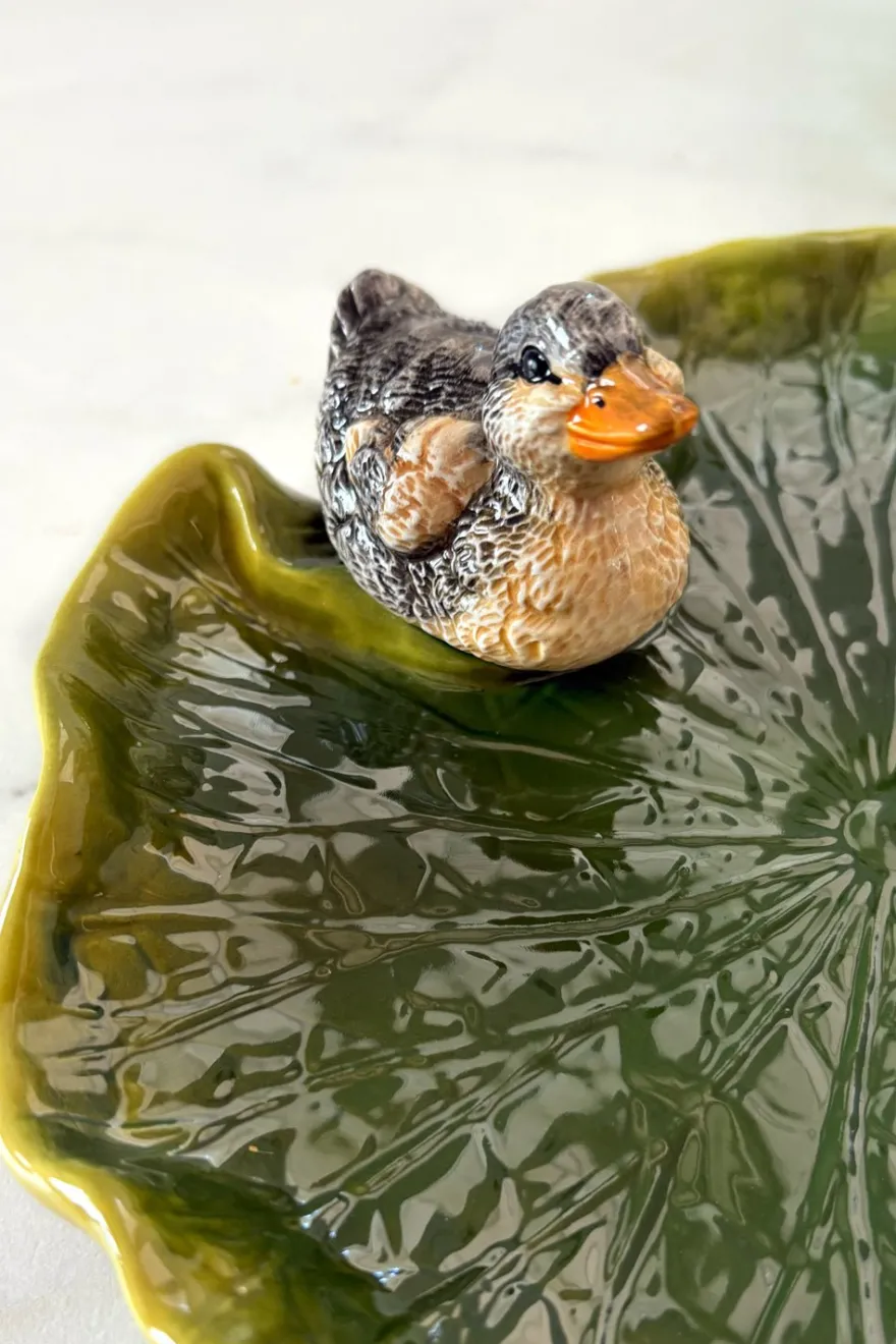 Este platito de porcelana, elaborado artesanalmente, presenta un delicado diseño de hoja verde y una figura de un pato que le da un toque especial y natural. Perfecto tanto para usar como vajilla en tus comidas o para decorar tu casa con un detalle único.