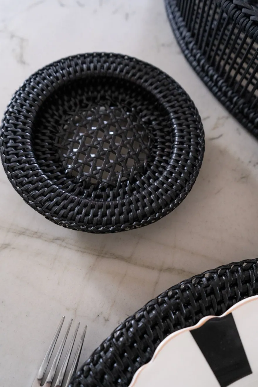 Plato de pan redondo de ratán en color negro, ideal para añadir un toque diferente y elegante a tu mesa, además de ser una pieza versátil que combina belleza y funcionalidad. Esta colección combina la belleza del material natural con la funcionalidad y el diseño contemporáneo.