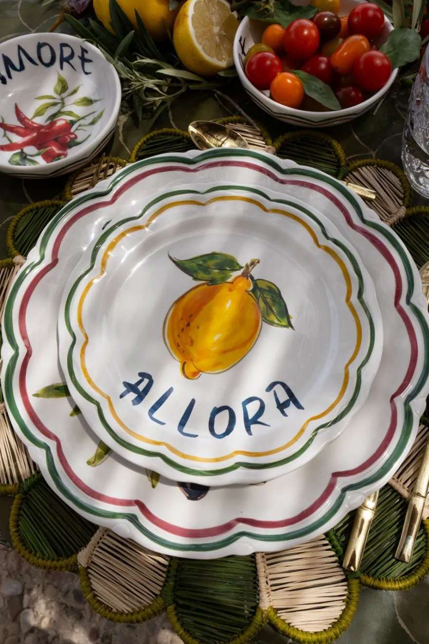 Nuestra vajilla de melamina está inspirada en la calidez, el color y la alegría de la cocina italiana. El plato de postre está decorado con la frase «Allora», acompañada de la ilustración de un limón emblemático del Mediterráneo.