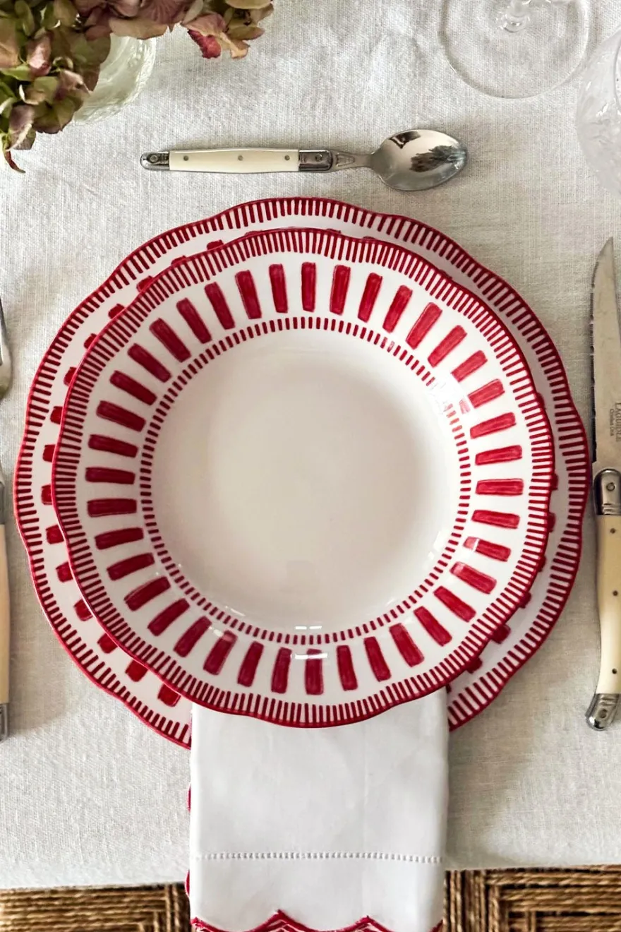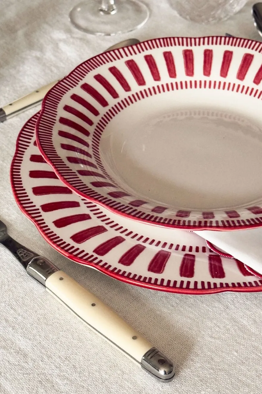 Plato hondo de nuestra vajilla de cerámica que combina la pureza del blanco con un alegre diseño en tonos rojos que aporta un estilo festivo y lleno de encanto. Cada pieza presenta un borde decorado con motivos geométricos y florales que realzan su carácter artesanal y su estética tradicional. Perfecta para usar tanto en el día a día como en ocasiones especiales. Resistente, decorativa y con un diseño que ilumina cualquier mesa, esta vajilla es ideal para quienes buscan añadir calidez, color y personalidad a sus comidas.