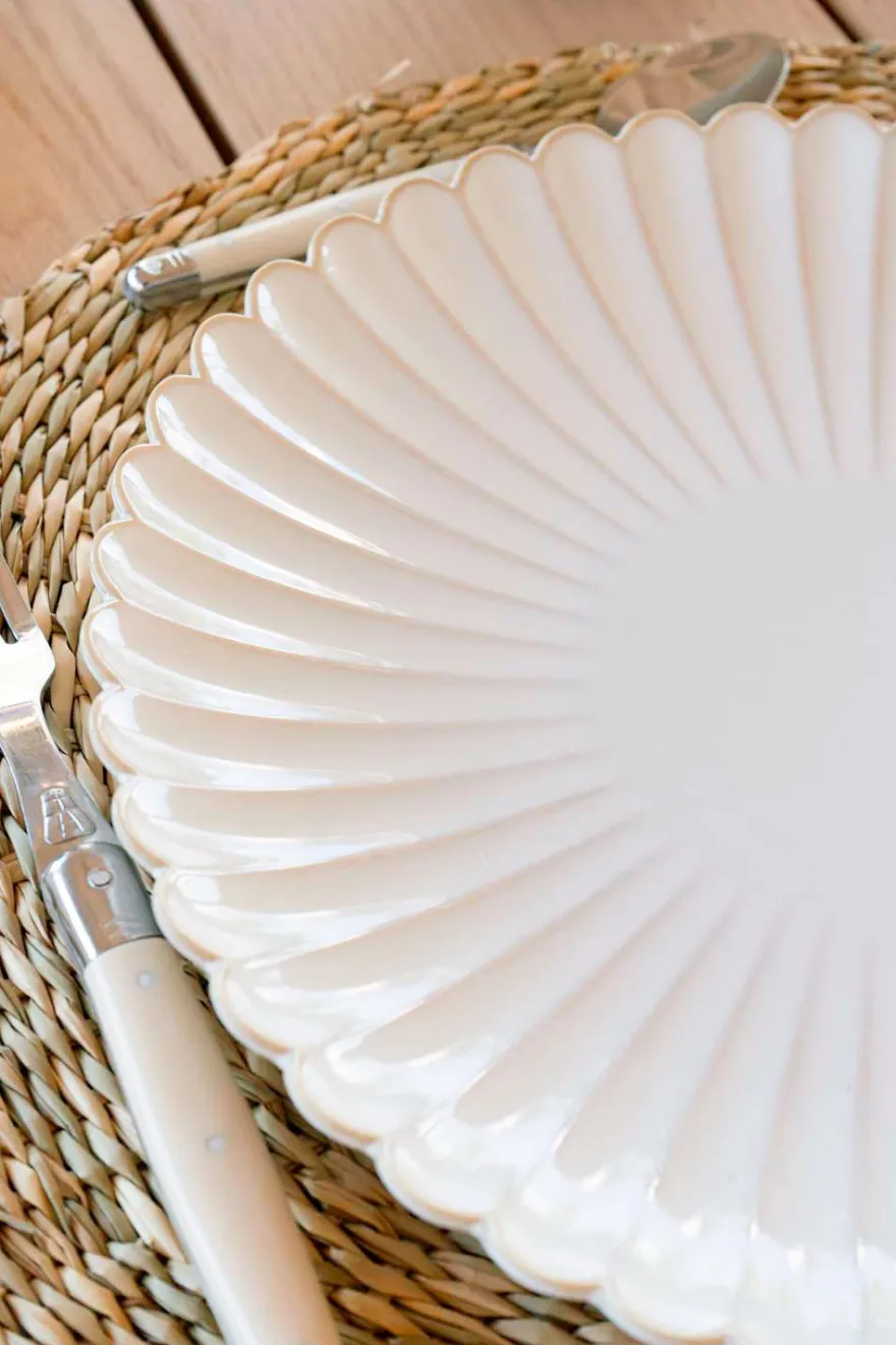 Plato llano de nuestra Vajilla Blanca Flor CO de Stoneware, muy resistente y gracias a su diseño único con ondas en color blanco y remates en tonos crudos, es versátil para disfrutarla en cualquier época del año.