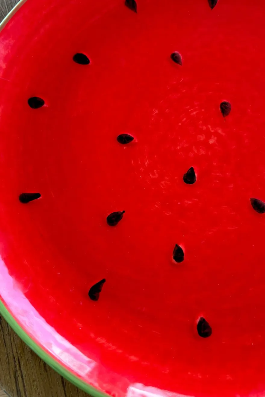 Plato llano de gres con diseño de sandía, ideal para dar un toque fresco, original y diferente a tus mesas durante cualquier época del año.
