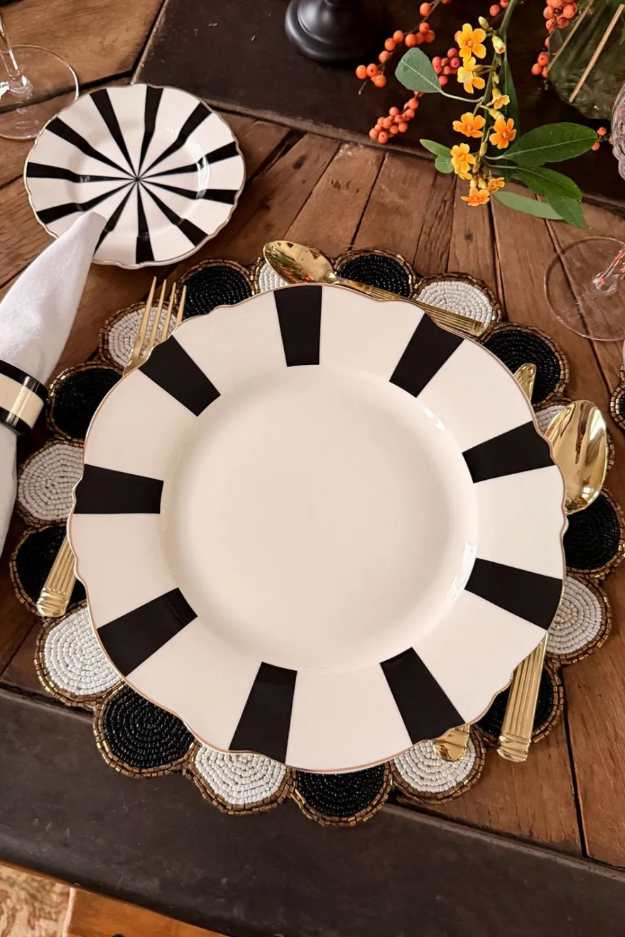 Diseñado con nuestros emblemáticos colores “blanco y negro” y con un delicado filo dorado decorando, que le dará a tu mesa el toque elegante que estabas buscando.