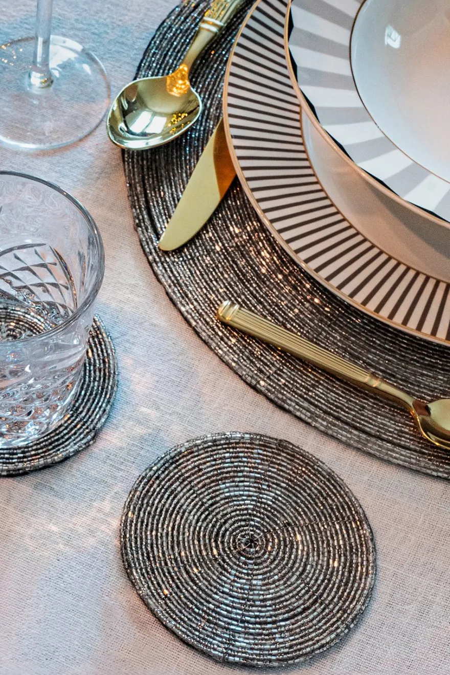 Este posavasos destaca por su exquisito bordado a mano con cuentas de bolitas con diseño plateado, que le da un toque de lujo y sofisticación a cualquier mesa. Las bolitas están cuidadosamente cosidas en patrones delicados, creando texturas y relieves que combinan elegancia con un diseño artístico único. Perfecto para cenas especiales o para elevar la decoración diaria de tu mesa.