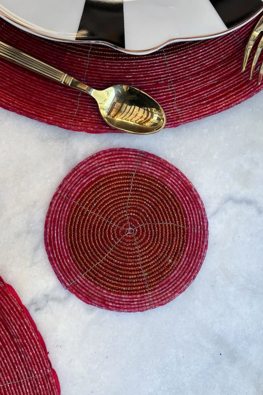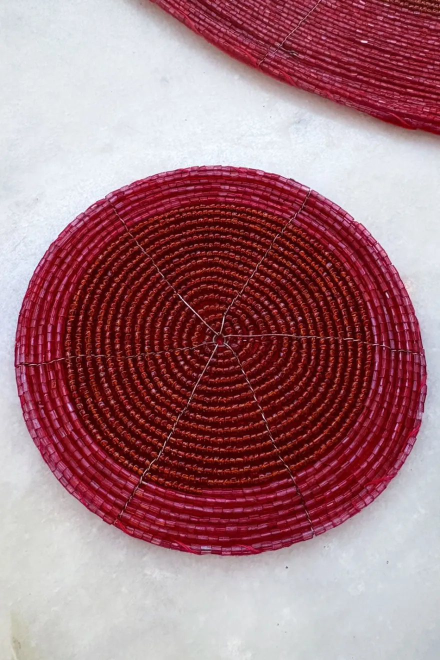 Este posavasos destaca por su exquisito bordado a mano, elaborado con finas cuentas rojas que aportan un toque de lujo adicional. Cada bolita está cuidadosamente cosida formando patrones delicados que crean una combinación única de textura, relieve y elegancia artística. Su diseño sofisticado transforma cualquier mesa, haciéndolo ideal tanto para cenas especiales como para elevar la decoración del día a día.