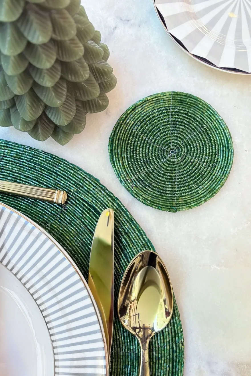 Este posavasos destaca por su exquisito bordado a mano, elaborado con finas cuentas verdes que aportan un toque de lujo adicional. Cada bolita está cuidadosamente cosida formando patrones delicados que crean una combinación única de textura, relieve y elegancia artística. Su diseño sofisticado transforma cualquier mesa, haciéndolo ideal tanto para cenas especiales como para elevar la decoración del día a día.