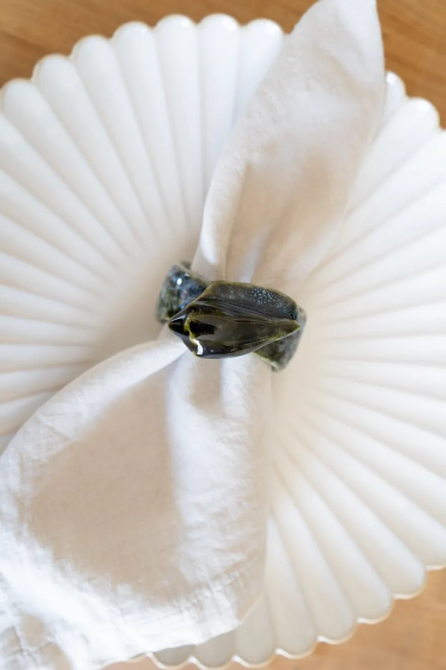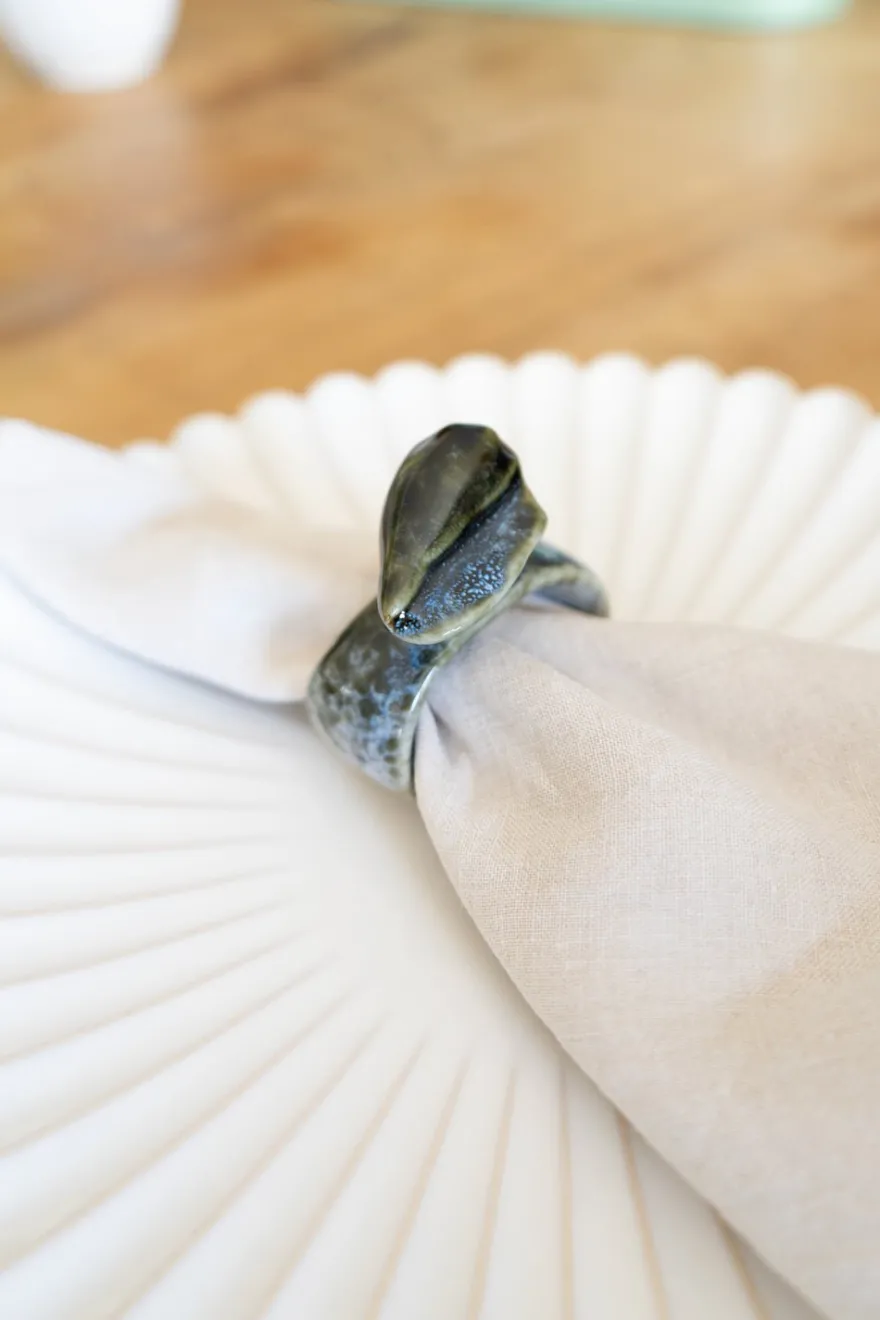 Servilletero de cerámica laqueada con diseño de concha de mar en color azul, ideal para complementar y dar frescura a tu mesa durante el verano.
