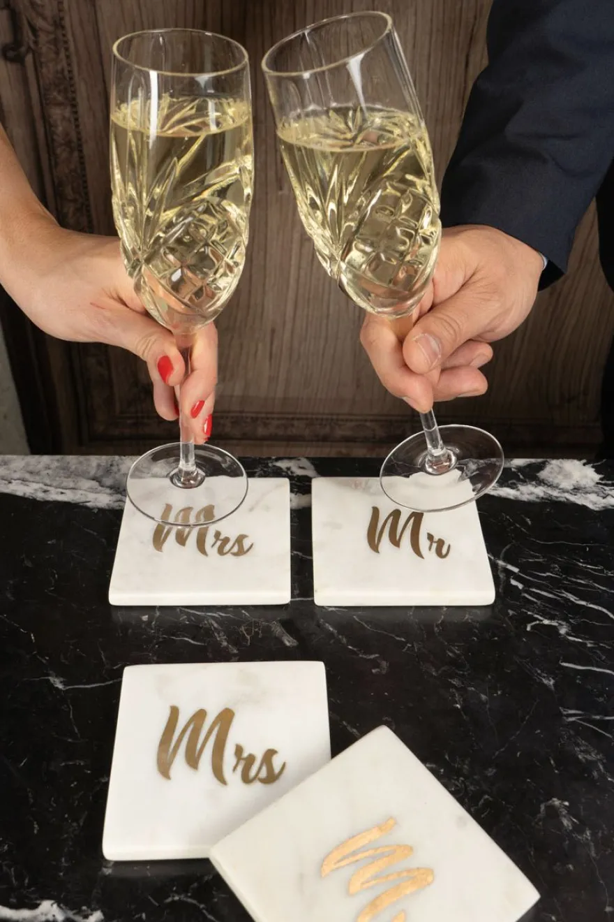 Set de dos posavasos cuadrados de mármol con diseño de Mr & Mrs de latón en color dorado, ideales para tener un detalle muy original con los que pronto se casarán, o incluso para pedidas de mano y aniversarios.