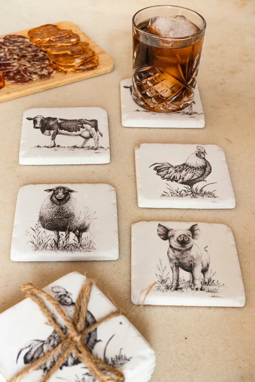 Set de cuatro posavasos de mármol con distintos diseños de animales de granja (oveja, gallo, cerdo y vaca), ideales y originales para complementar tu mesa.
