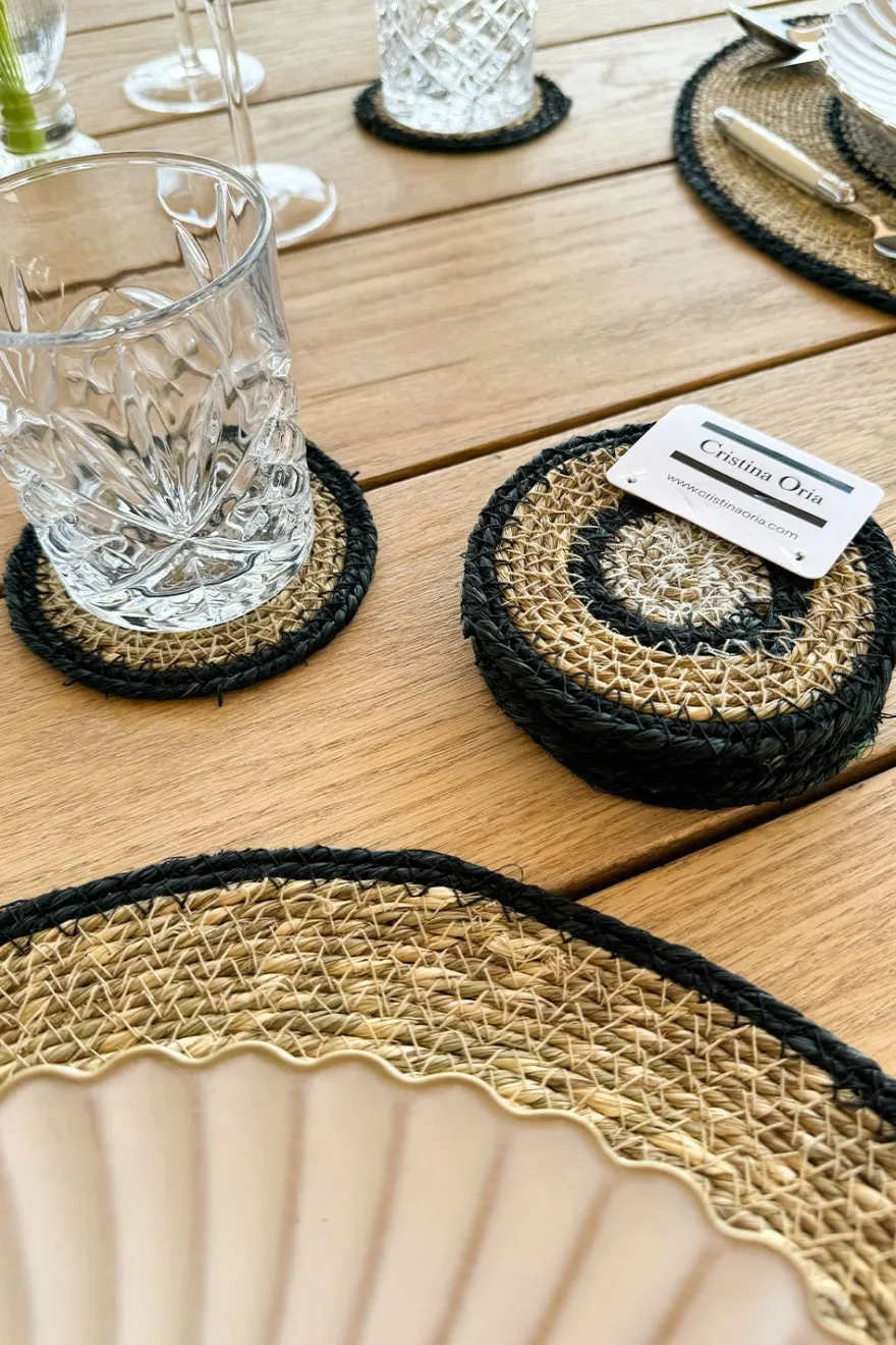 Set de seis posavasos de seagrass en tonos beige natural y negro, un accesorio esencial para proteger tu mesa y, al mismo tiempo, añadir un toque decorativo con estilo. Elaborado con seagrass (también conocido como hierba marina), material que es naturalmente fuerte y resistente, ideal para un uso frecuente sin perder su forma ni integridad. Su versatilidad lo hace perfecto para adaptarse a una variedad de estilos decorativos.
