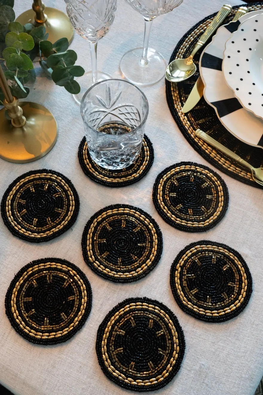 Estos posavasos destacan por su exquisito bordado a mano con cuentas de bolitas con diseño negro y detalles dorados, que le dan un toque de lujo y sofisticación a cualquier mesa. Las bolitas están cuidadosamente cosidas en patrones delicados, creando texturas y relieves que combinan elegancia con un diseño artístico único. Perfectos para cenas especiales o para elevar la decoración diaria de tu mesa.