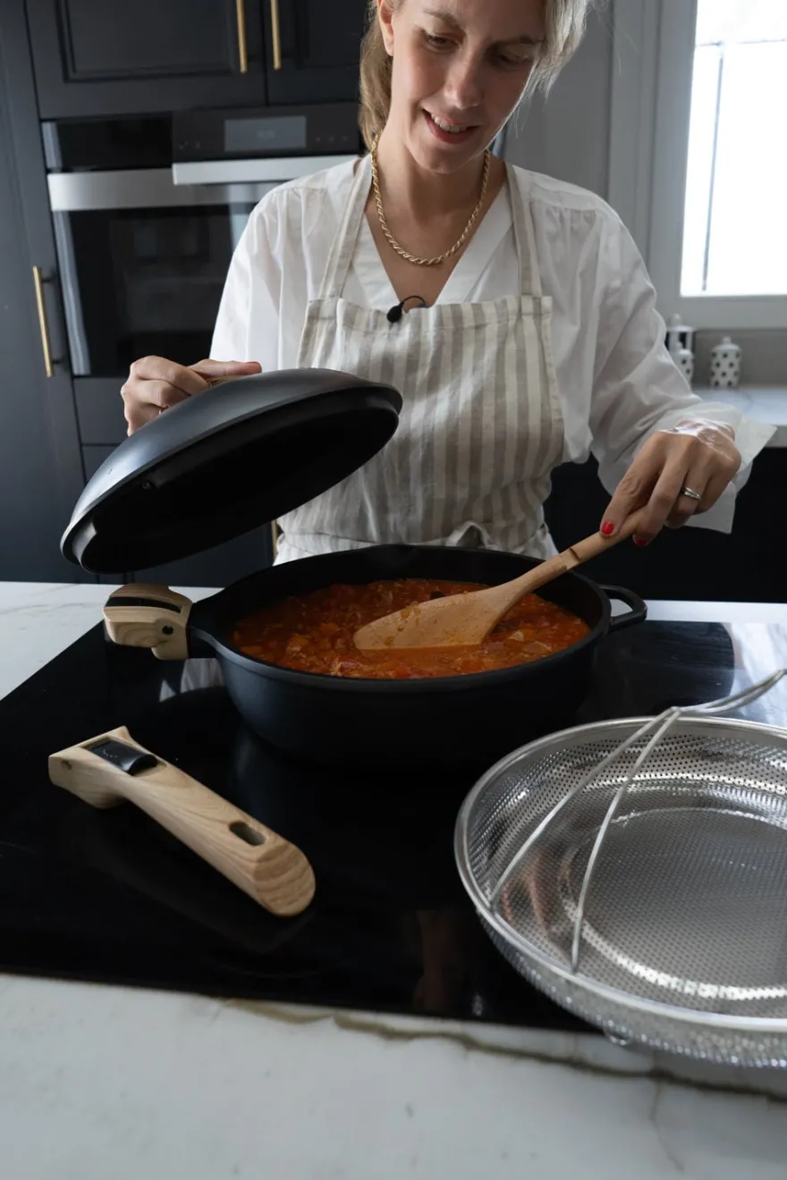 Sartén multiusos con ocho utilidades en una: horno, saltear, cocina al vapor, molde para pasteles, cocotte, olla, freír y sartén.