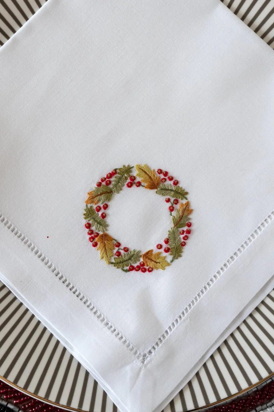 Elegante servilleta de 100% algodón bordada a mano, adornada con una corona de Navidad en una de sus esquinas. Cada detalle de la corona está trabajado en hilos verdes, rojos y dorados.