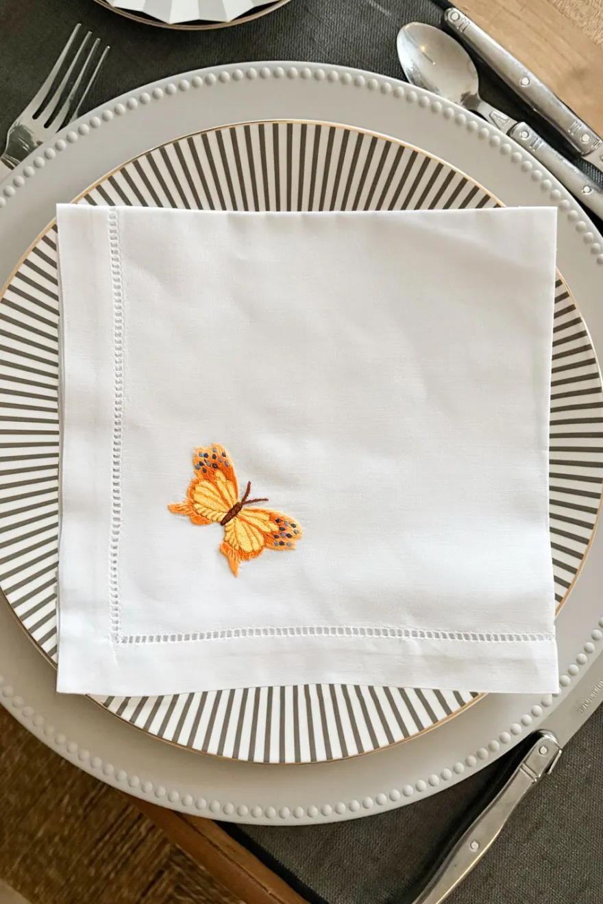 Servilleta de algodón 100% bordada a mano, pensada para vestir la mesa con elegancia natural y encanto artesanal. Su diseño presenta una delicada mariposa en tonos amarillos, bordada puntada a puntada con hilo, convirtiendo cada pieza en un pequeño detalle único.