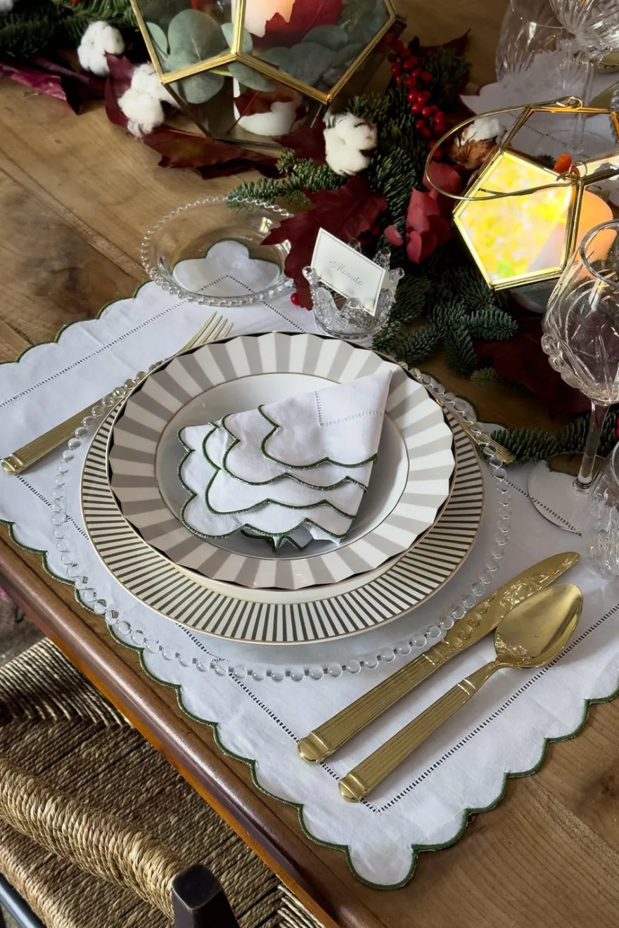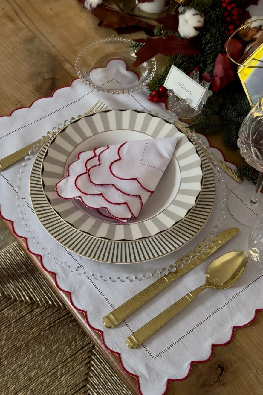 Esta elegante servilleta de cóctel está confeccionada en hilo de algodón blanco de alta calidad, lo que le otorga un acabado suave y duradero. Su diseño destaca por un delicado detalle de vainica y borde ondulado, disponible en remate de color rojo o verde oscuro.