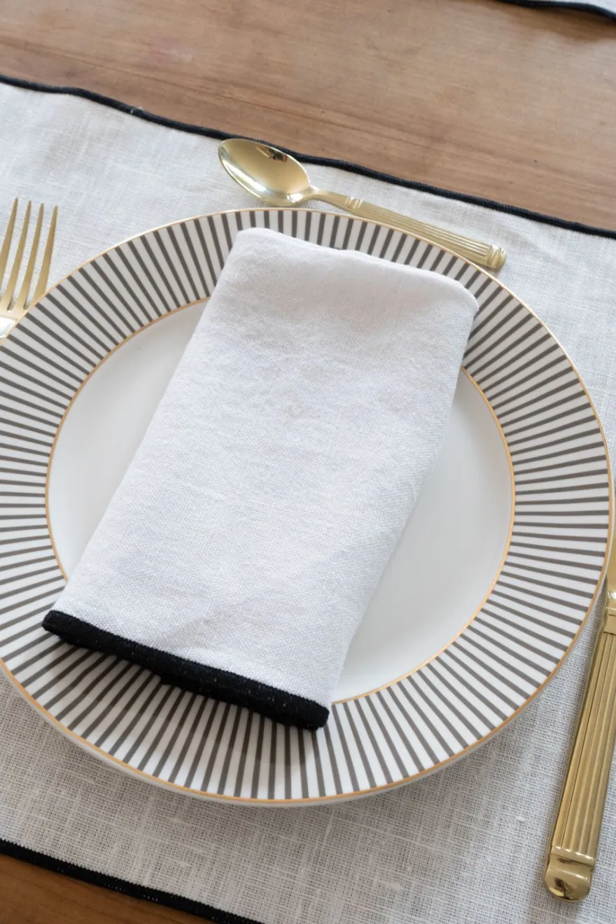 Servilleta de lino hecha a mano, en color blanca con borde en color negro, que le dará un aspecto fresco, elegante y lujoso a tu mesa. Se puede usar a diario o para una gran celebración.