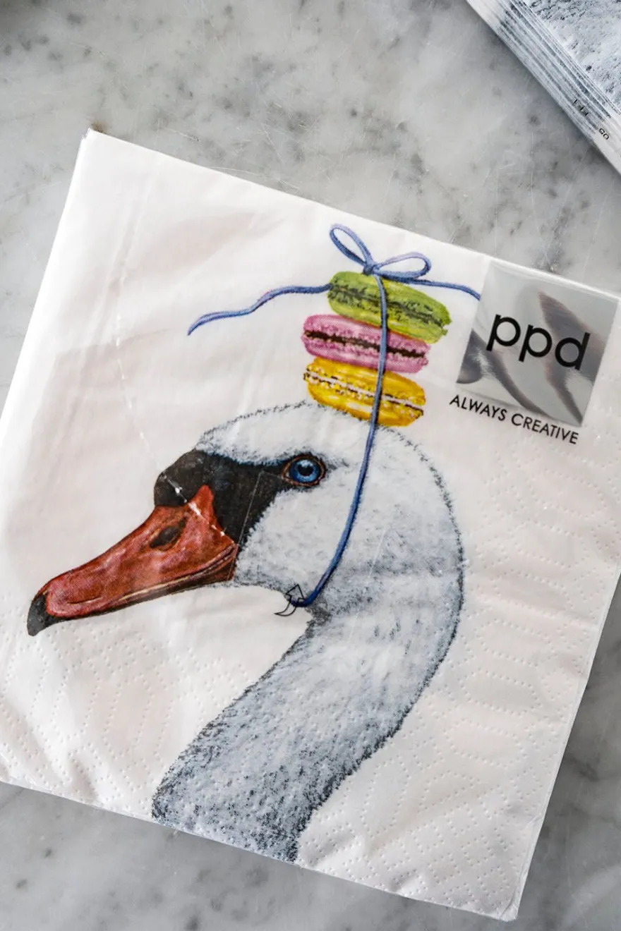 Servilletas de papel con ilustración de la cabeza de un cisne con macarons, ideales para complementar tu mesa.