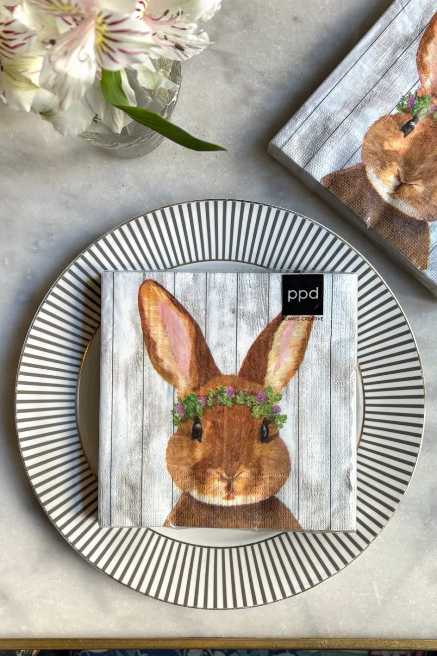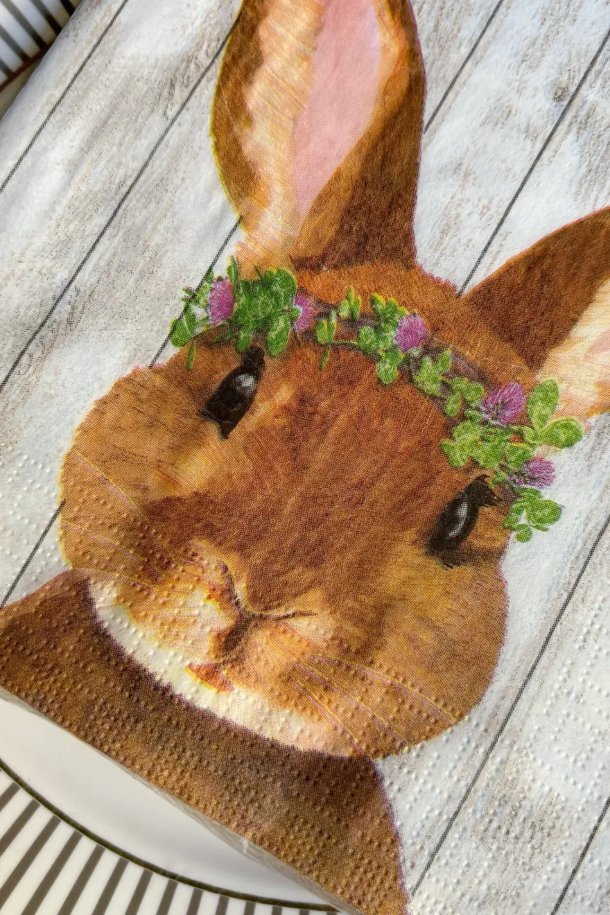 Servilletas de papel con la ilustración de un conejo con corona de flores verdes, ideales y originales para complementar tu mesa.