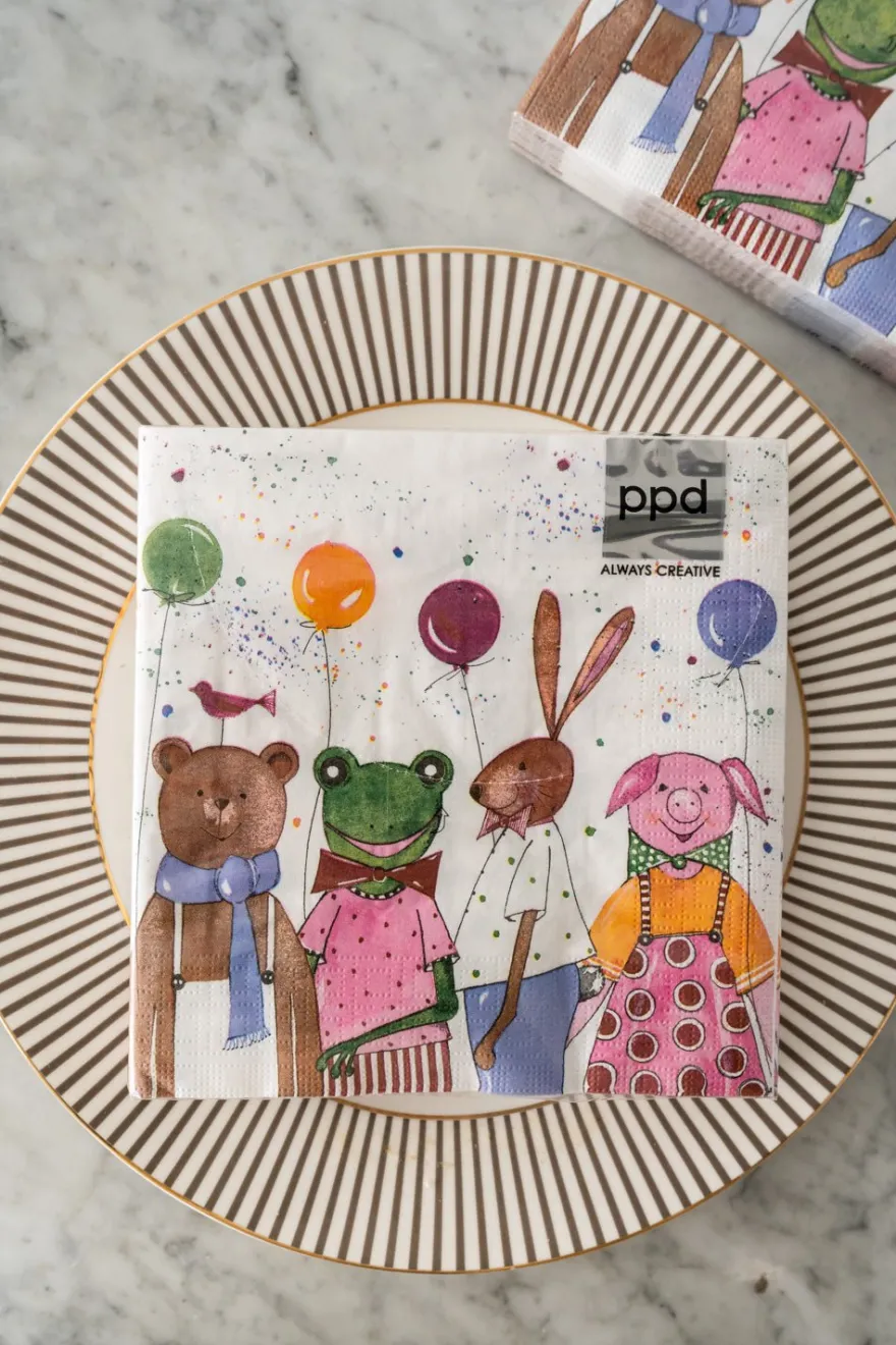 Servilletas de papel con ilustración de animales de fiesta, ideales para complementar tu mesa en celebraciones de cumpleaños.