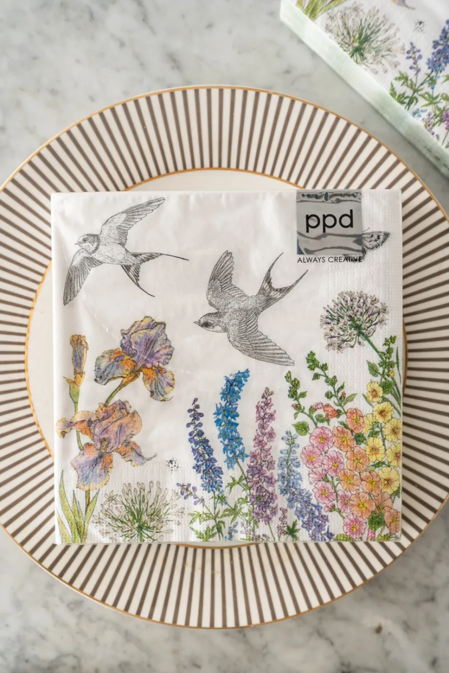 Servilletas de papel con ilustración de aves y flores, ideales para complementar y dar color a tus mesas en primavera.