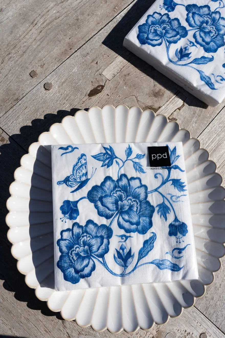 Servilletas de papel con ilustración de peonias azules, ideales para complementar y dar color a tus mesas.