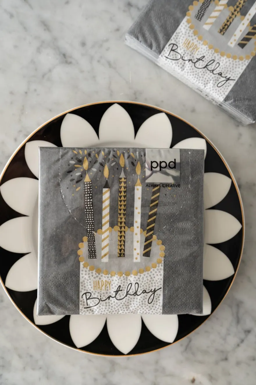 Servilletas de papel con ilustración de una tarta y mensaje «Happy Birthday», ideales para complementar tu mesa en celebraciones de cumpleaños.
