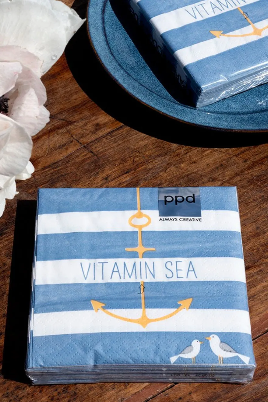 Servilletas de papel con ilustración de ancla y mensaje «vitamin sea», ideales para complementar tu mesa en verano o para llevarlas al barco.